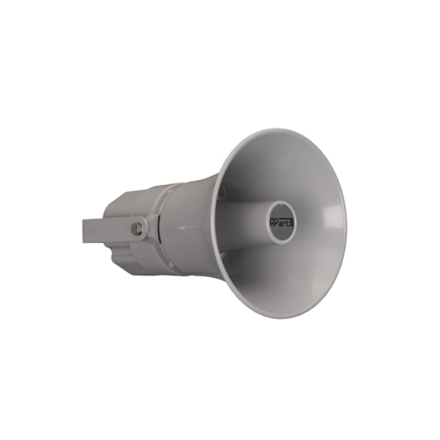 Рупорний всепогодний індустріальний гучномовець 25 Вт/100 В для передачі мови і сигналів оповіщення. Повністю металева конструкція. Гучномовець складається з горна та драйвера й обладнаний трансформатором 100 В. Високий звуковий тиск і широкий кут дисперсії дозволяють озвучувати великі площі. Монтажне кріплення дозволяє регулювати спрямованість звуку на 180°. Корпус виконаний з алюмінію.