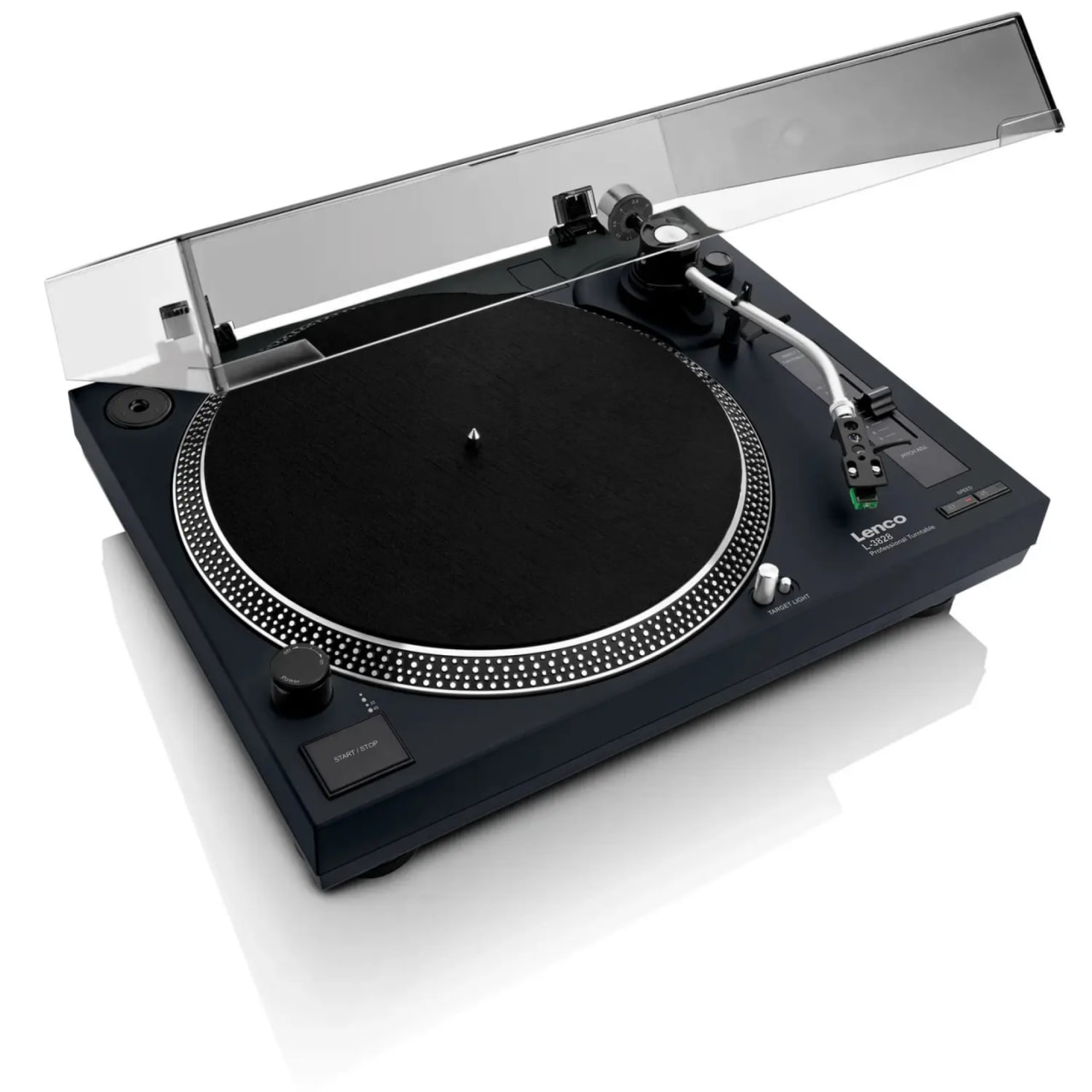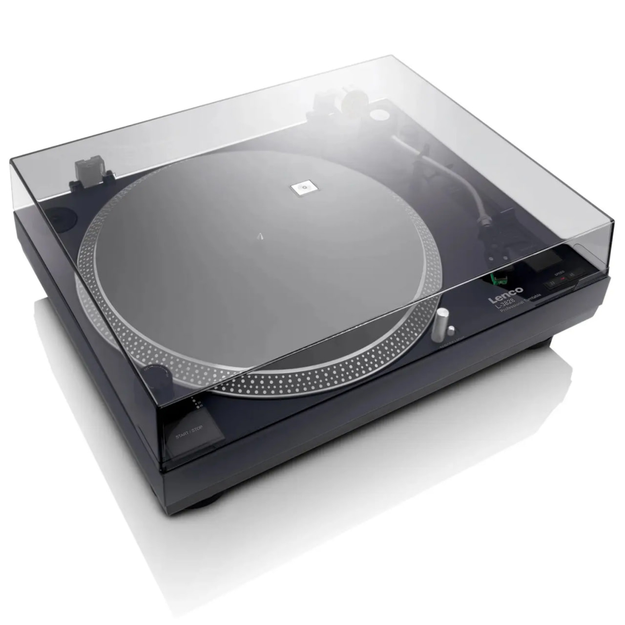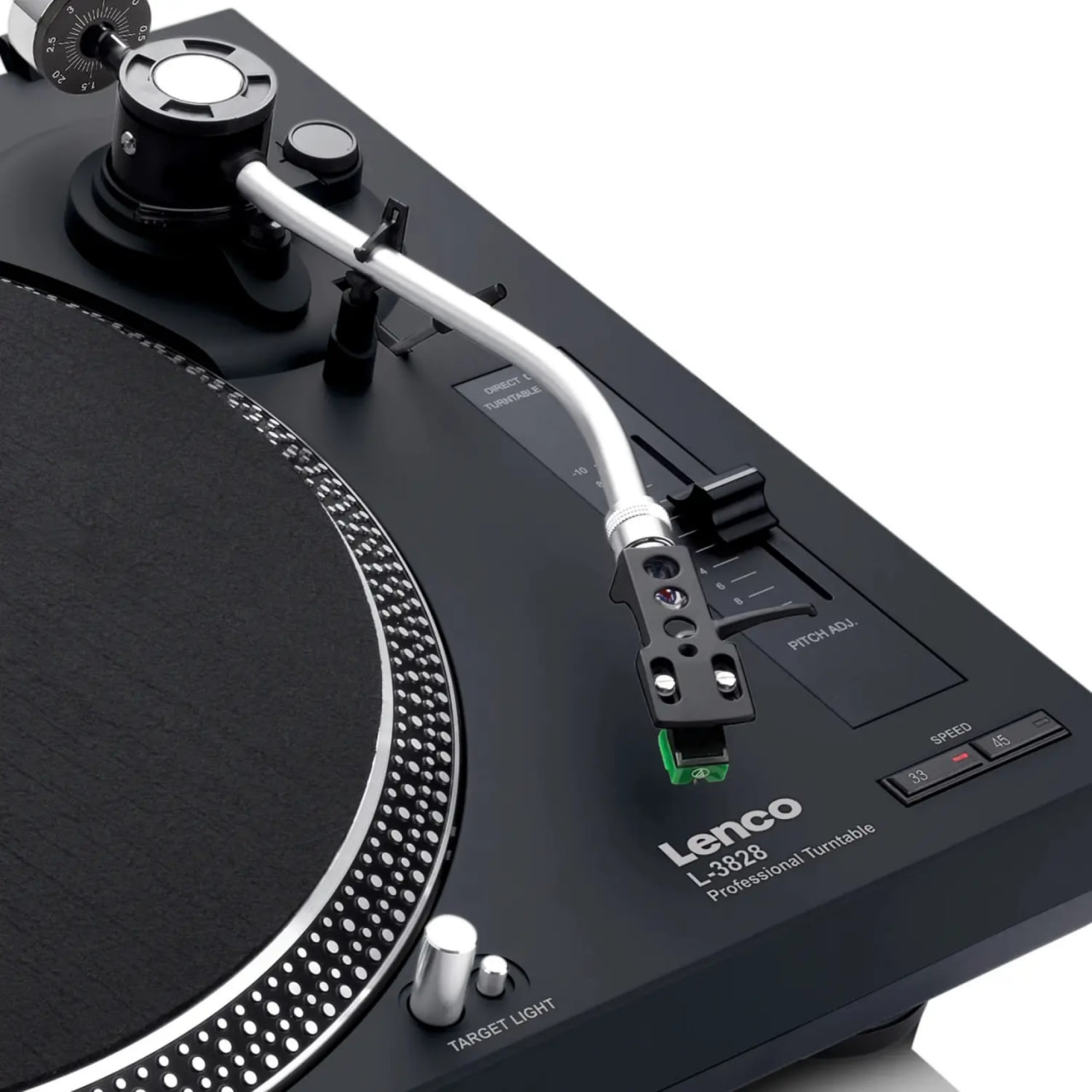 Ласкаво просимо у світ відмінного звучання з вініловим програвачем Lenco L-3828BK. Це високоякісний, професійний прямоприводний програвач, який ідеально підходить для діджеїв. Прямий привід гарантує миттєвий старт грамплатівки, відомий як 'quick start'. Програвач оснащений підсвічуванням для оптимальної зручності в експлуатації та стробоскопом. Легко регулюйте швидкість Вашого програвача за допомогою регулятора зміни висоти звуку. Зі вбудованим фоно-підсилювачем Ви можете підключити Lenco L-3828BK безпосередньо до Вашого мікшера або стерео-системи.