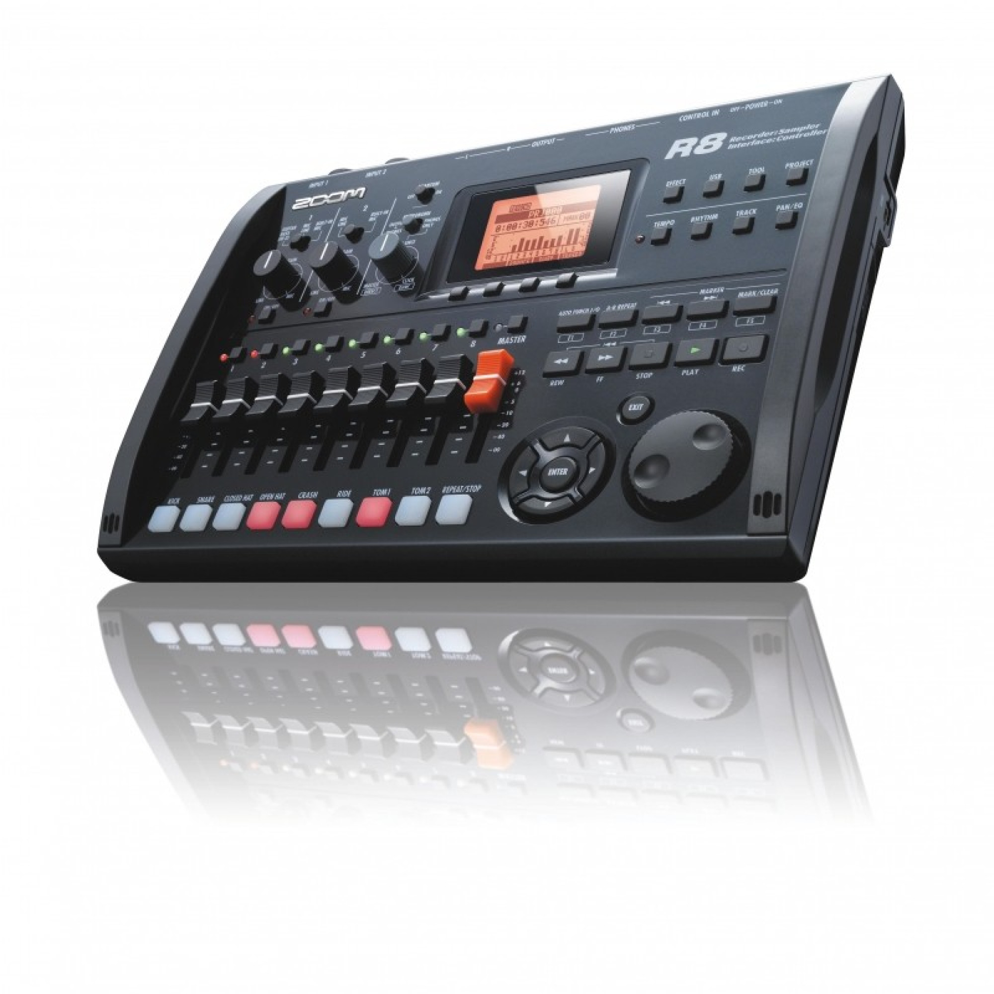 Як і R24, Zoom R8 оснащений чотирма інструментами, восьми доріжковим відтворенням і 2-треками одночасного запису, що використовує карту пам'яті SD. R8- це цифровий мульти-трековий рекордер, аудіо інтерфейс, контролер і семплер. Пристрій має невеликий розмір, тому легко може поміститися в кейс для гітар або сумку для виступів. Незважаючи на такий розмір, R8 забезпечує гнучкі і портативні рішення багатодоріжкового запису. Семплер складається з 24 вбудованих голосів, а вбудовані драм звуки можна викликати використовуючи 8 педів і 3 основних клавіші, щоб призначити звуки на кожен трек і створити лупи. Крім того, ви можете використовувати драм-машину пристрою, щоб створити оригінальні біти, або метроном для управління темпом. R8 поставляється з картою пам'яті SD 2 Гб і підтримує до 32 Гб SDHC карт, максимум 100 годин треків. За словами Zoom, використовуючи SD для запису, R8 стає не тільки більш легким і портативним, але і забезпечує підвищену надійність. Використовуючи USB-аудіо інтерфейс пристрою, ви можете взяти R8 в вашу студію і записати додаткові треки. Коли ви будете готові до зведення, використовуйте R8 в якості контролера для управління кожною функцією програмного забезпечення DAW за вашим вибором. R8 додатково пропонує 150 гітарних і студійних ефектів професійної якості.