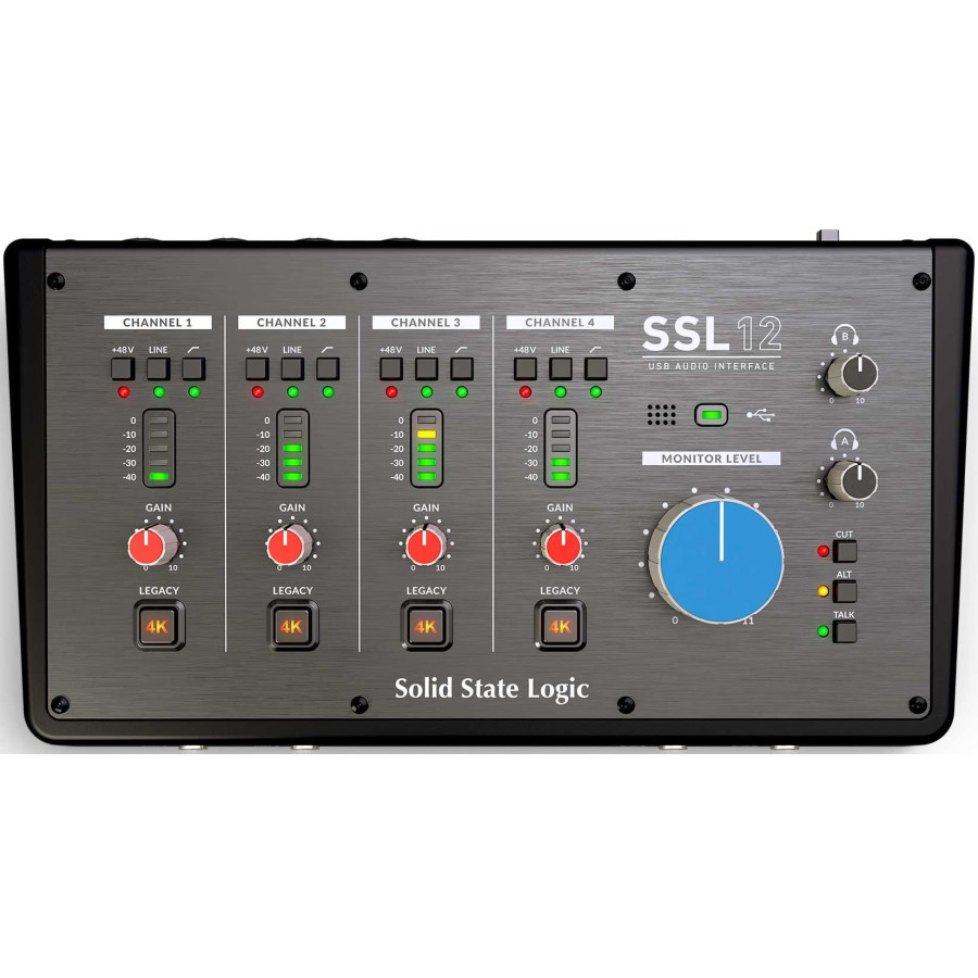 Solid State Logic SSL 12 оснащений чотирма аналоговими передпідсилювачами, які забезпечують величезний діапазон підсилення та неперевершену якість звуку. Ці передпідсилювачі живляться від USB і поєднують у собі спеціально обрані низькошумні транзистори з інтегральними схемами, що забезпечує винятково низький рівень шуму (-130 дБу EIN) та широкий діапазон підсилення (62 дБ).