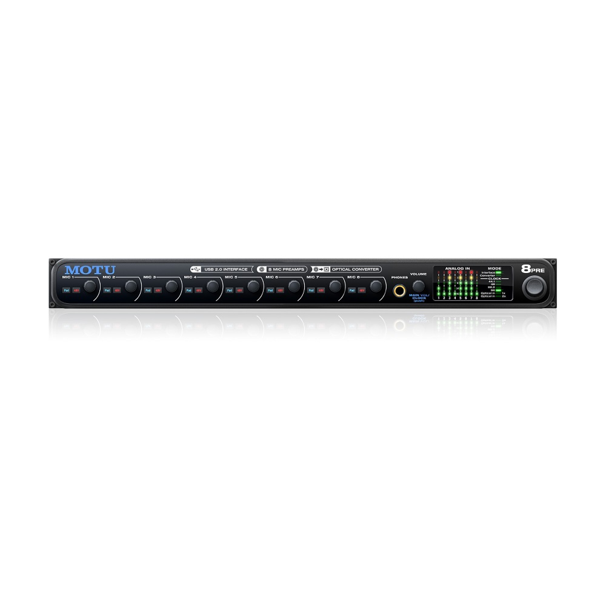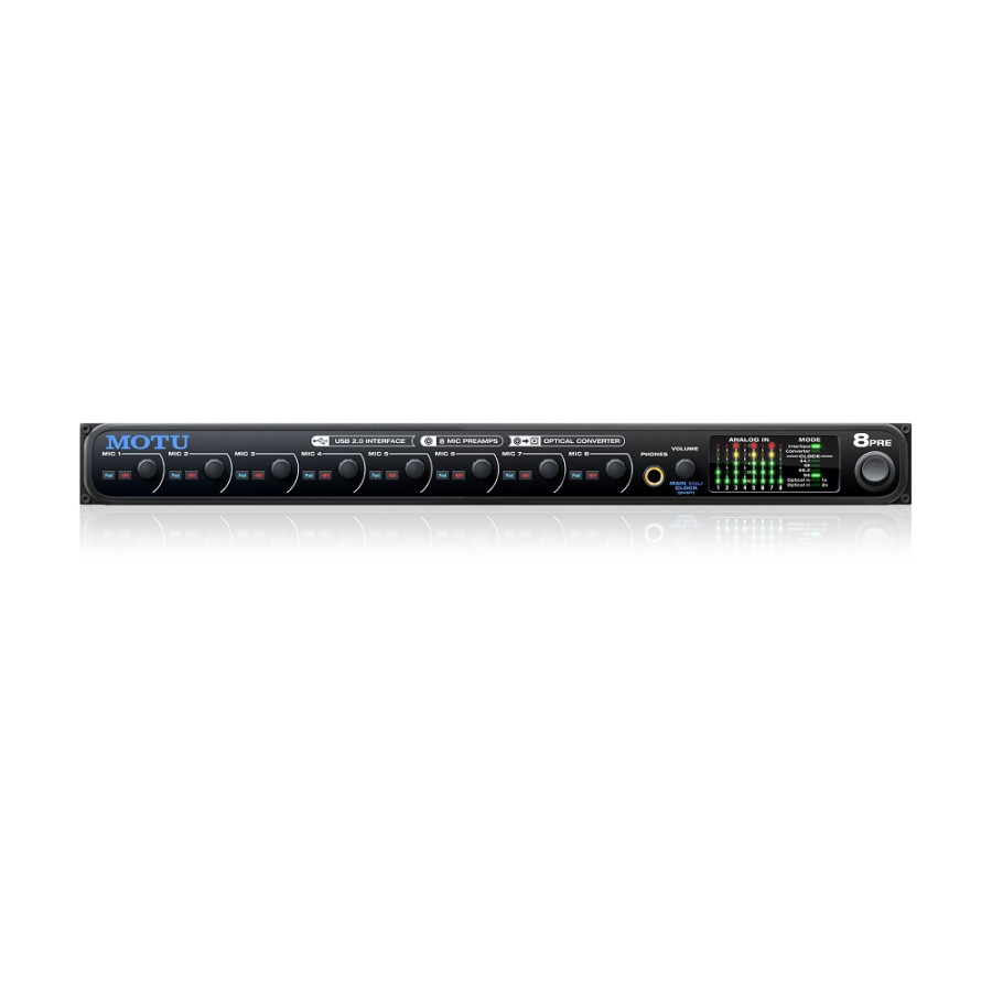 Аудіоінтерфейс 8pre USB має вісім передпідсилювачів студійної якості з підтримкою фантомного живлення, а також 8-канальний оптичний цифровий інтерфейс ADAT (до 96 кГц). Розширити систему можна за рахунок підключення додаткового 8pre або інших аудіоінтерфейсів MOTU.