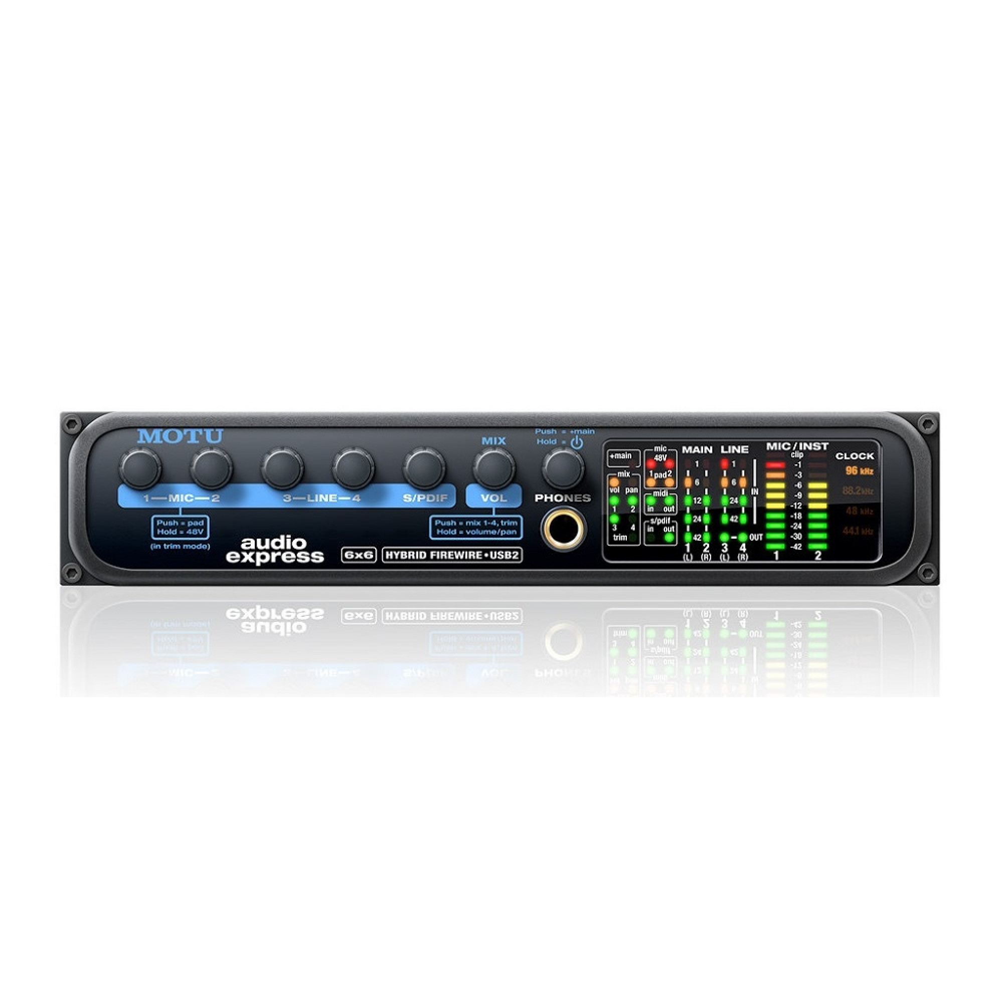 У новій гібридній моделі, що отримала ім'я Audio Express, реалізовані як FireWire, так і USB. Але цим функціональність інтерфейсу не обмежується. Пристрій має 6 аудіо входів і 6 виходів. Завдяки гібридній технології MOTU, Audio Express володіє між платформною сумісністю з Mac або PC через порт FireWire або високошвидкісний порт USB 2.0. Ви можете підключити мікрофон, гітару, клавішні та цифрові пристрої введення, і займатися професійним звукозаписом у Вашій персональній студії. Так як інтерфейс має чотири стерео шини, Audio Express дозволяє створювати абсолютно окремий мікс для кожної пари виходів (основні виходи, лінійні виходи, S/PDIF вихід і phone).